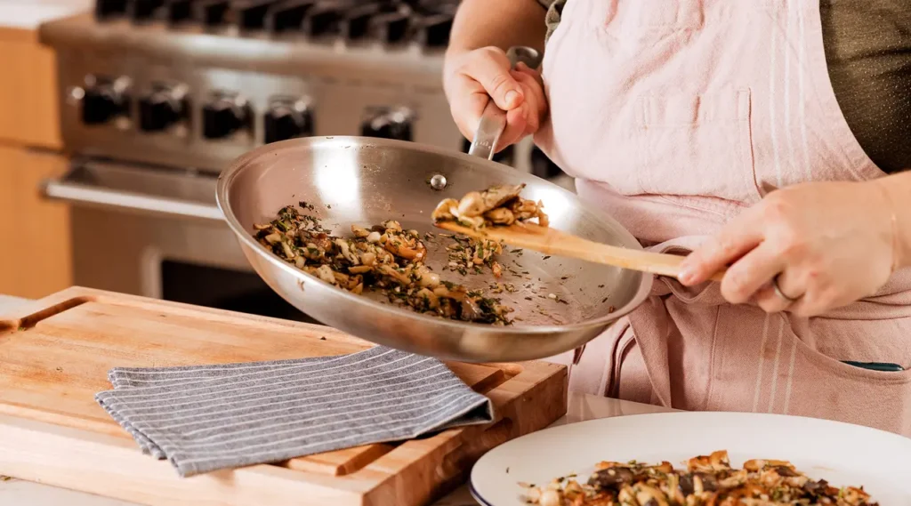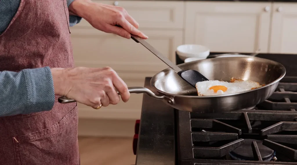 Make sure to avoid abrasive cleaning tools not specifically formulated for stainless steel, such as steel wool, as they can scratch your pan’s surface.